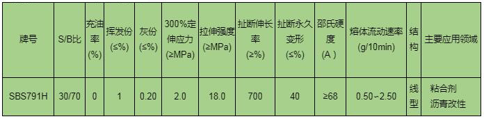 熱塑性丁苯橡膠HT791H(SBS1301-1)加入瀝青中,可使瀝青克服冬脆夏軟的缺點,既可以用于鋪設(shè)和修補高級公路,也可以制作質(zhì)量優(yōu)異的防水隔熱材料。熱塑性丁苯橡膠